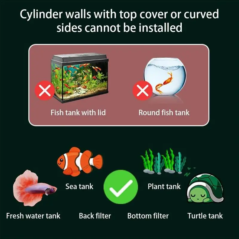 Applicable fish tank wall thickness: no more than 1.5cm/0.6inches; not fit for framed fish tanks and curved fish tanks
